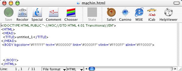 Oui oui, le TextEdit d'Apple ! Pour vous en servir comme éditeur d'HTML, il faut être en mode texte puis simplement taper du code normal. Vous ne pouvez pas enregistrer direct en HTML, il faut donc une fois la page finie ajouter depuis le Finder le .html. Mais malgré tout, je ne vois pas pourquoi on utiliserait TextEdit, vue la qualité d'autres logiciels.